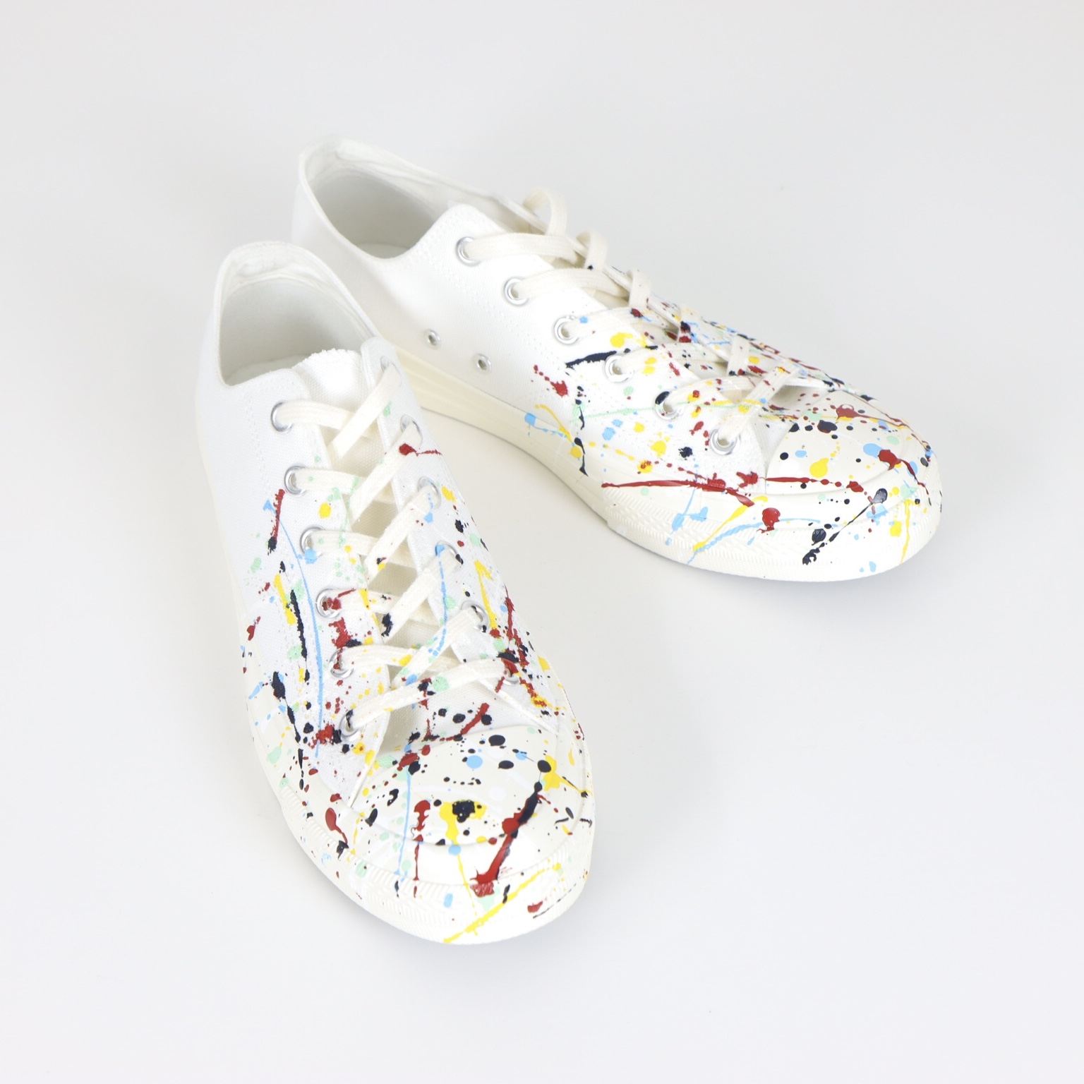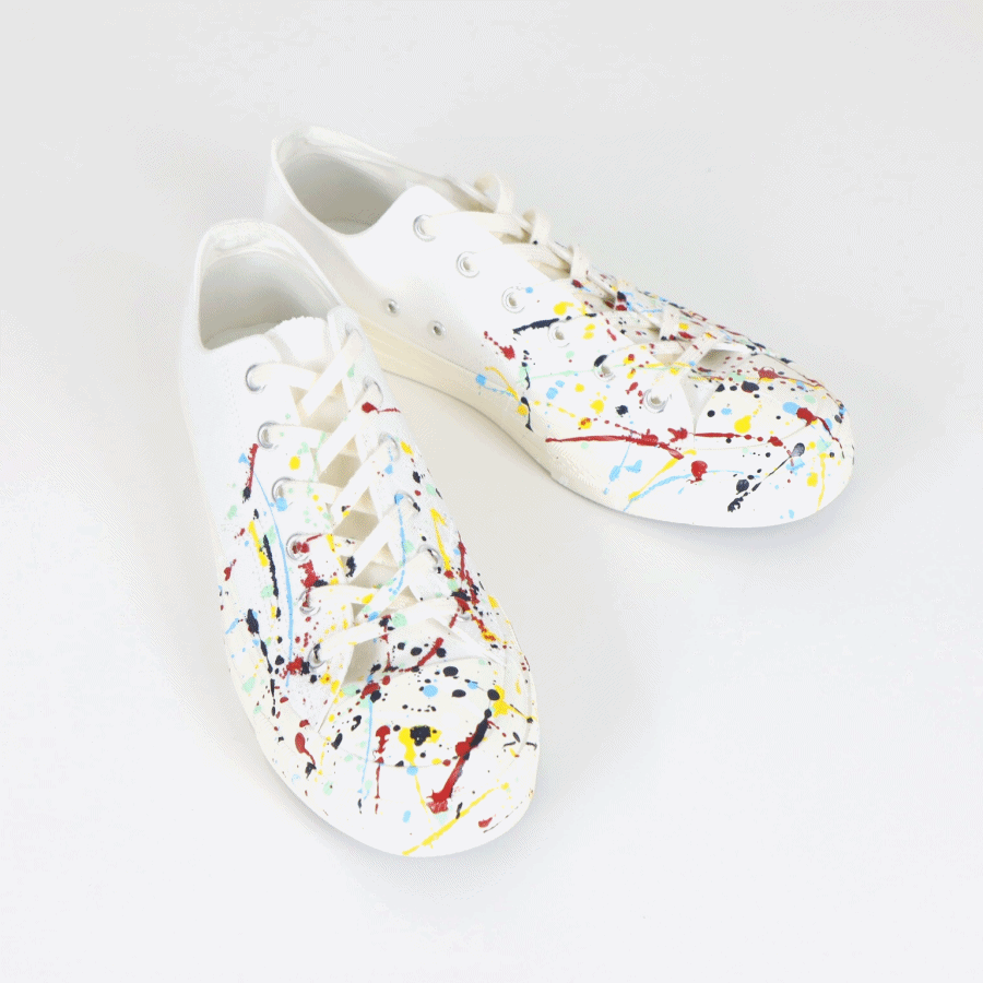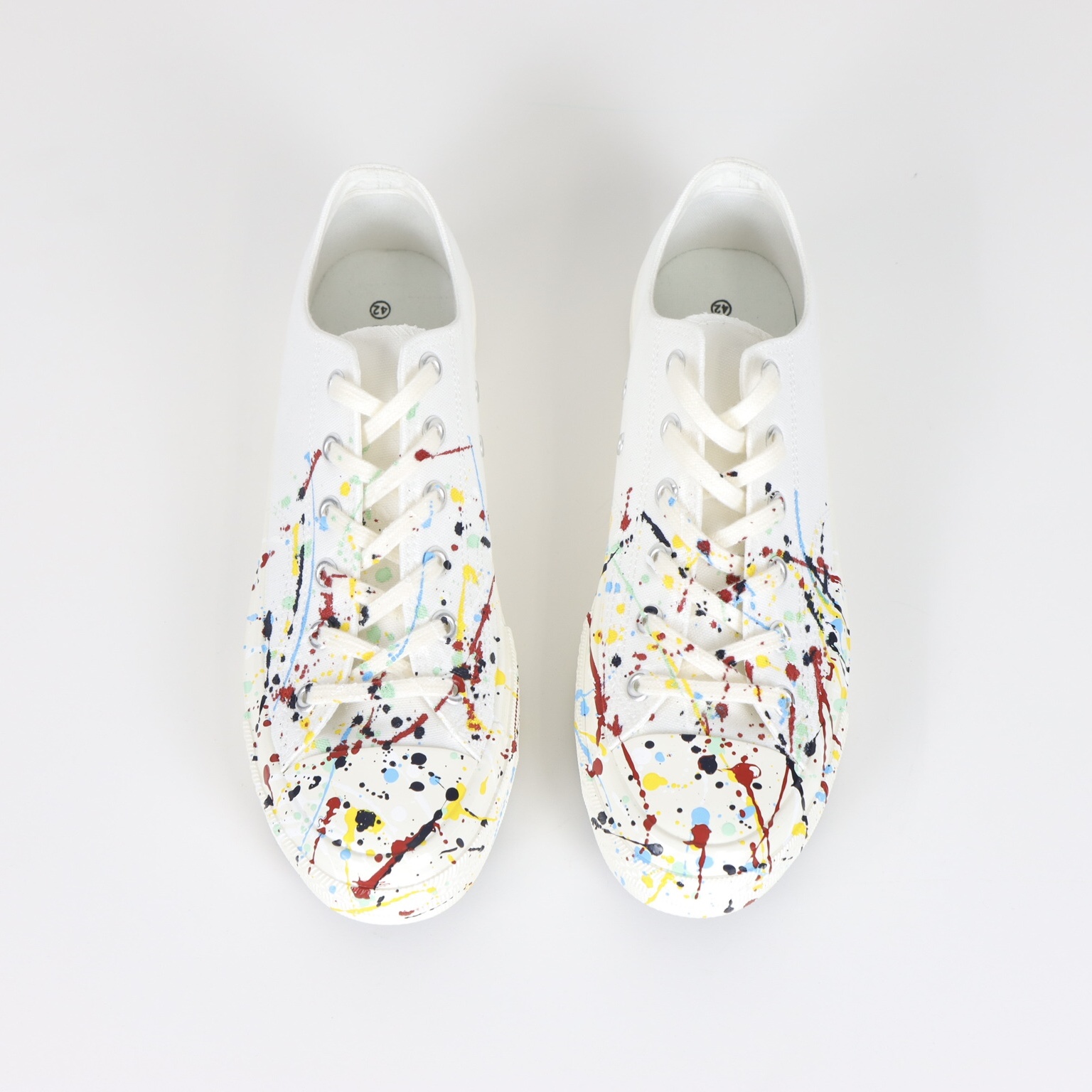 무지 화이트 로우탑 스니커즈에 액션페인팅한 제품입니다.톤이 정말 이쁘고요 완전 화이트가아닌 아이보리 계열컬러입니다.액션페인팅을 더해 유니크하고 신었을떄 정말 이쁜 제품입니다~가격저렴하게 나왔으니 많은 문의 부탁드립니다~