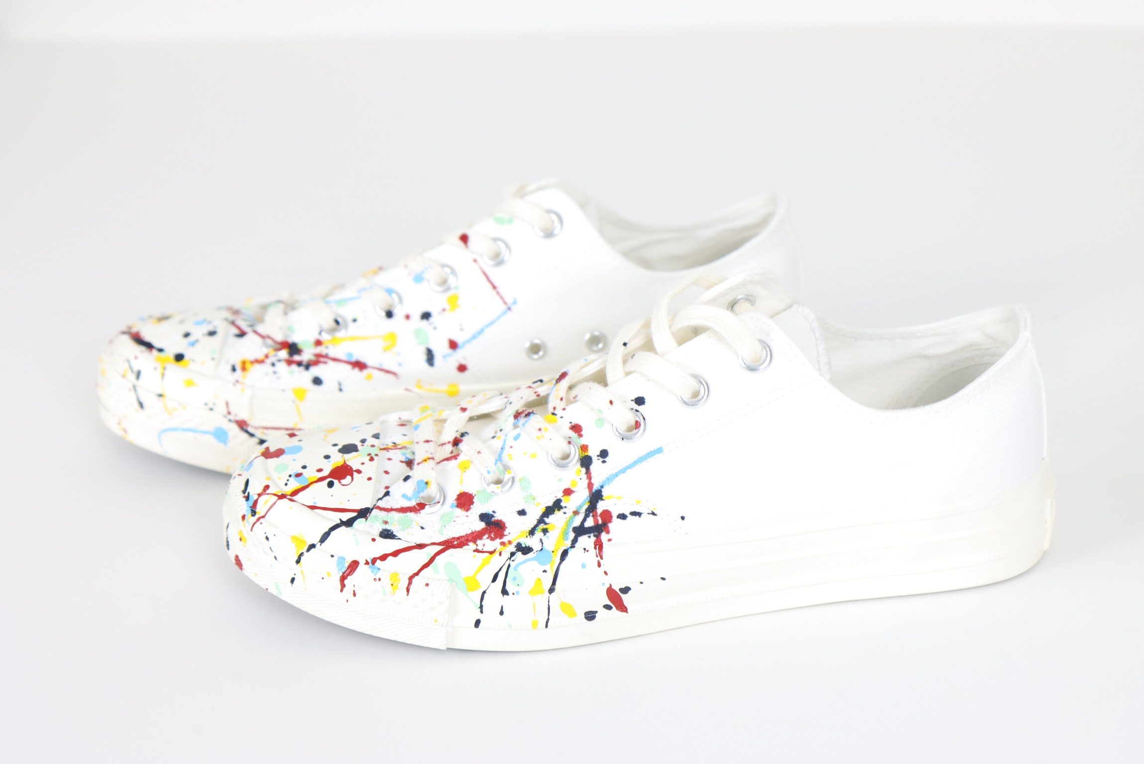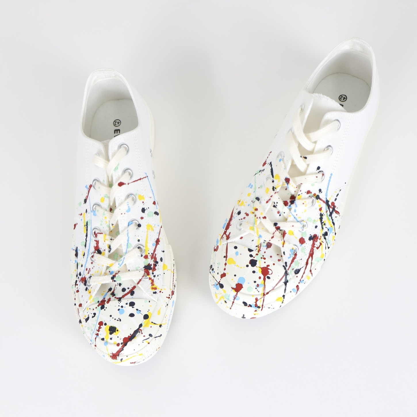 무지 화이트 로우탑 스니커즈에 액션페인팅한 제품입니다.톤이 정말 이쁘고요 완전 화이트가아닌 아이보리 계열컬러입니다.액션페인팅을 더해 유니크하고 신었을떄 정말 이쁜 제품입니다~가격저렴하게 나왔으니 많은 문의 부탁드립니다~